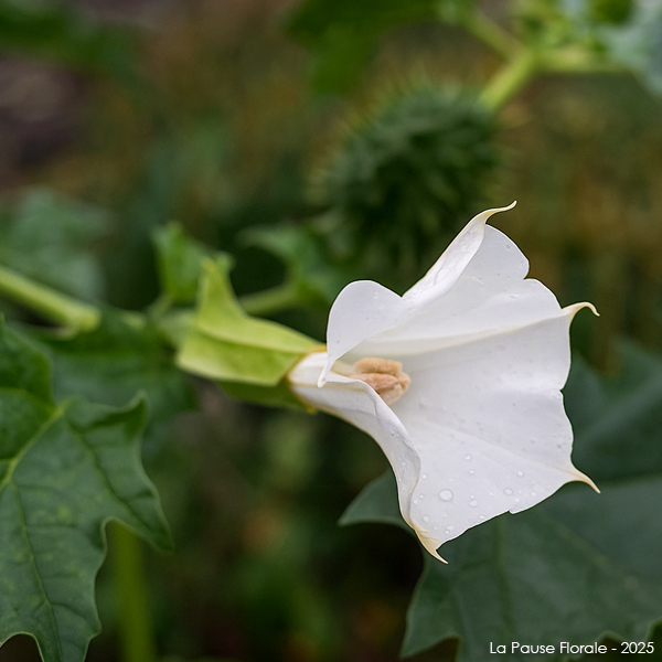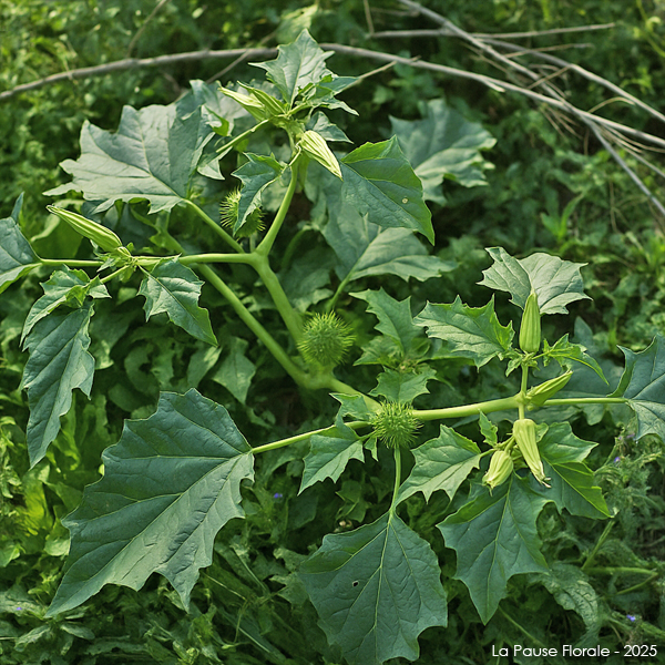 Au fil de notre balade, nous avons eu la surprise d’apercevoir une plante appartenant à la famille des Solanacées — celle qui rassemble des espèces bien connues comme la tomate, l’aubergine, la pomme de terre et le poivron. Il s’agissait du datura, une plante aussi fascinante que redoutable, surnommée « herbe du diable » ou « trompette du diable » en raison de sa toxicité et de ses grandes fleurs spectaculaires.