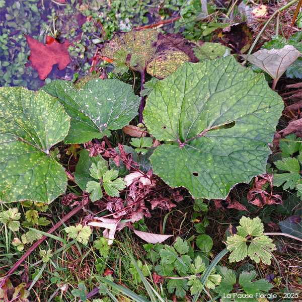 Confusion possible. Une fois la floraison terminée, le tussilage peut être confondu avec la pétasite hybride (Petasites hybridus), dont les feuilles sont similaires en taille et en forme. Toutefois, la pétasite possède un port plus massif et une floraison différente, ce qui permet de les distinguer avec attention.
