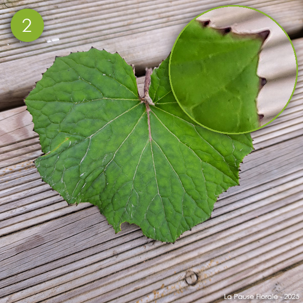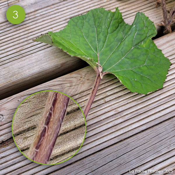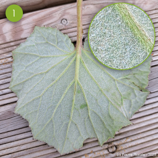 Les feuilles, qui apparaissent après la floraison, forment une rosette basale. Elles sont cordiformes, coriaces, à marge dentée, et présentent sur leur face inférieure une dense pilosité blanchâtre (photo 1). Le bord du limbe est ponctué de petits mucrons violacés (photo 2), et le pétiole, canaliculé, forme une rigole centrale bien visible (photo 3).